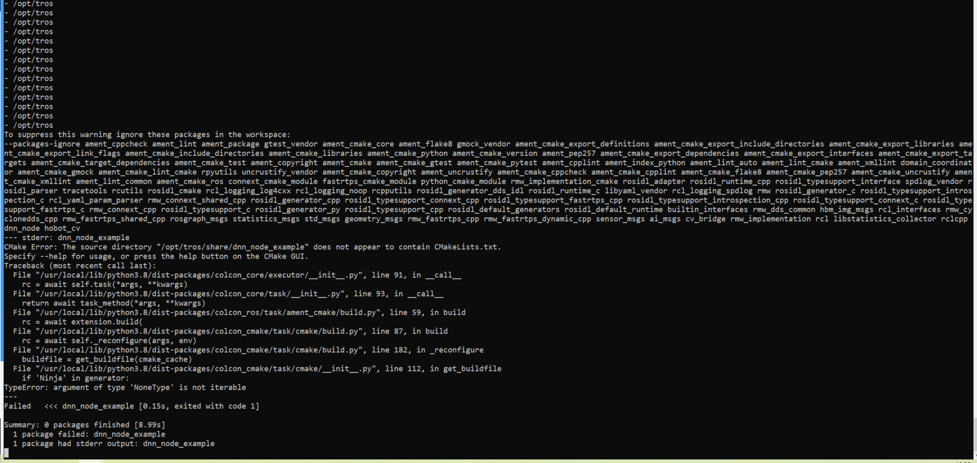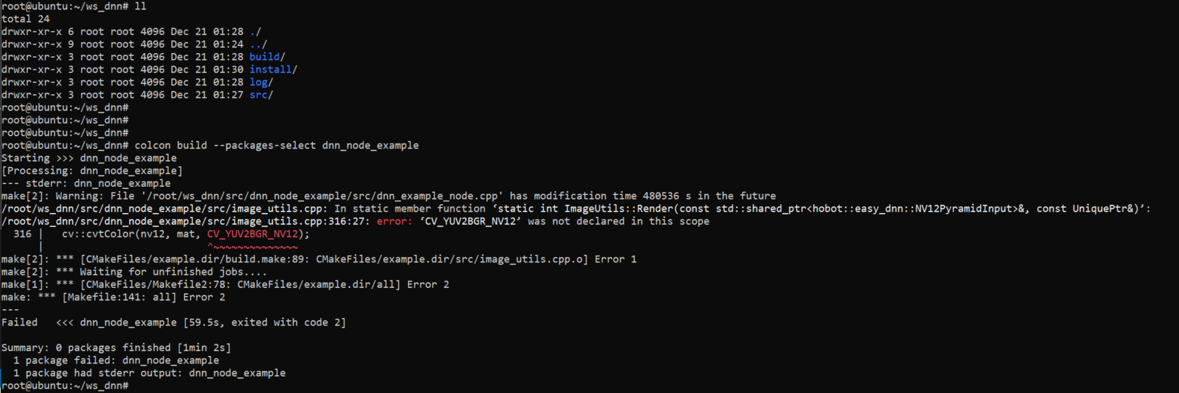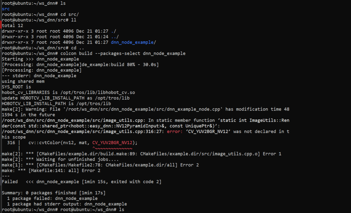 您好,大佬,我想在X3 ubuntu上编译dnn_node_example 这个功能包但是报了BUG,是不是执行colcon bulid 时所在的目录不对?另外,这个readme有点不太详细,dnn_node_example目录下面的文件也不全,有没有更详细的步骤?或者示例?
