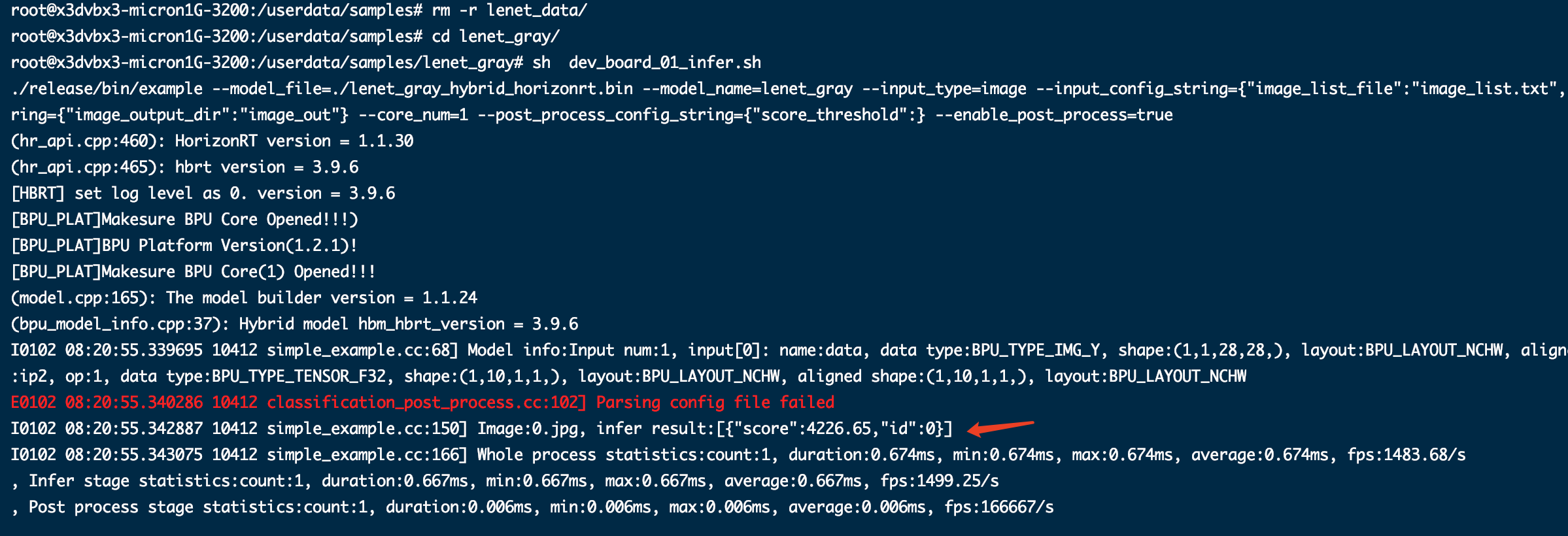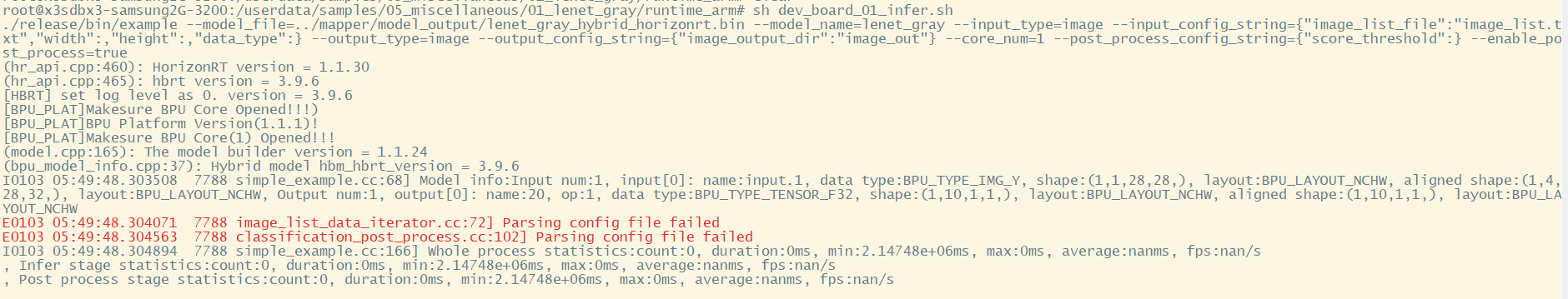 你好,这个问题我基于 1.1.17e 版本工具链进行了复现,是有一行红字打印,不过并不影响最终结果的推理。我这边是正常跑出来了推理结果和耗时情况。