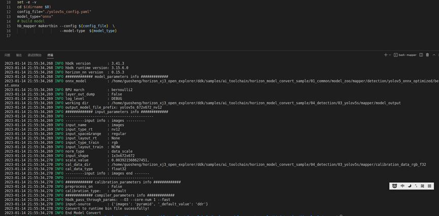 具体参考地平线旭日X3派用户手册,需要进行环境的配置安装,创建转换环境,下载事例包,在事例包中替换校准数据(训练数据中取50张标准数据)、校准模型(转换好的onnx模型)
