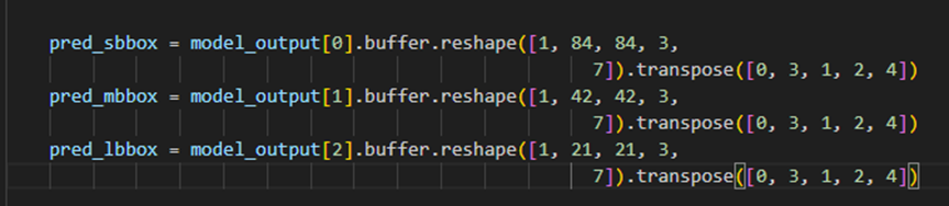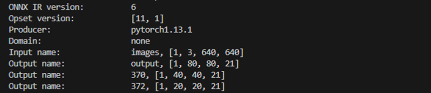 这里大家需要注意下,运行的过程中会有模型的输出结构信息,需要记录下来,上板我们的后处理需要根据这里进行一定的调整和修改,这里是640分辨率,2分类的输出,不同分辨率会有不同的特征输出。