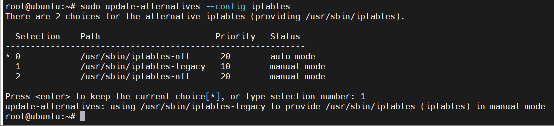 sudo update-alternatives --config iptables # 选择 iptables-legacy 版本