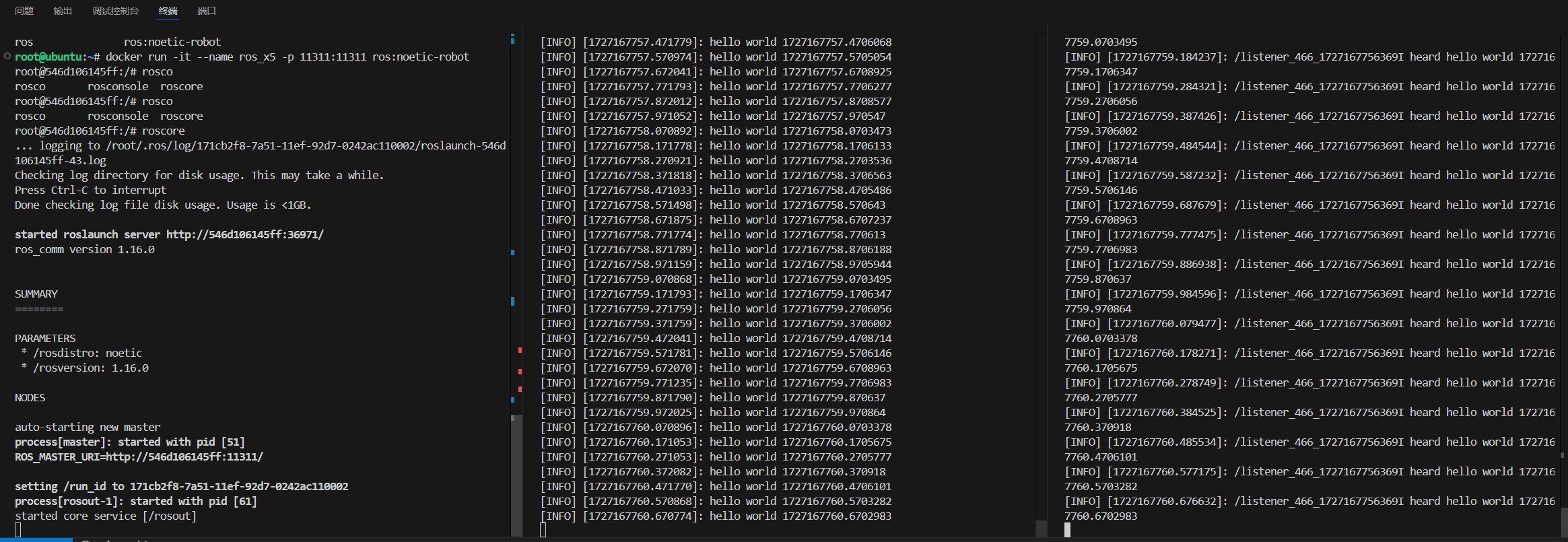docker exec -it ros_x5 /bin/bash source /opt/ros/noetic/setup.bash rosrun rospy_tutorials listener.py#结果展示: