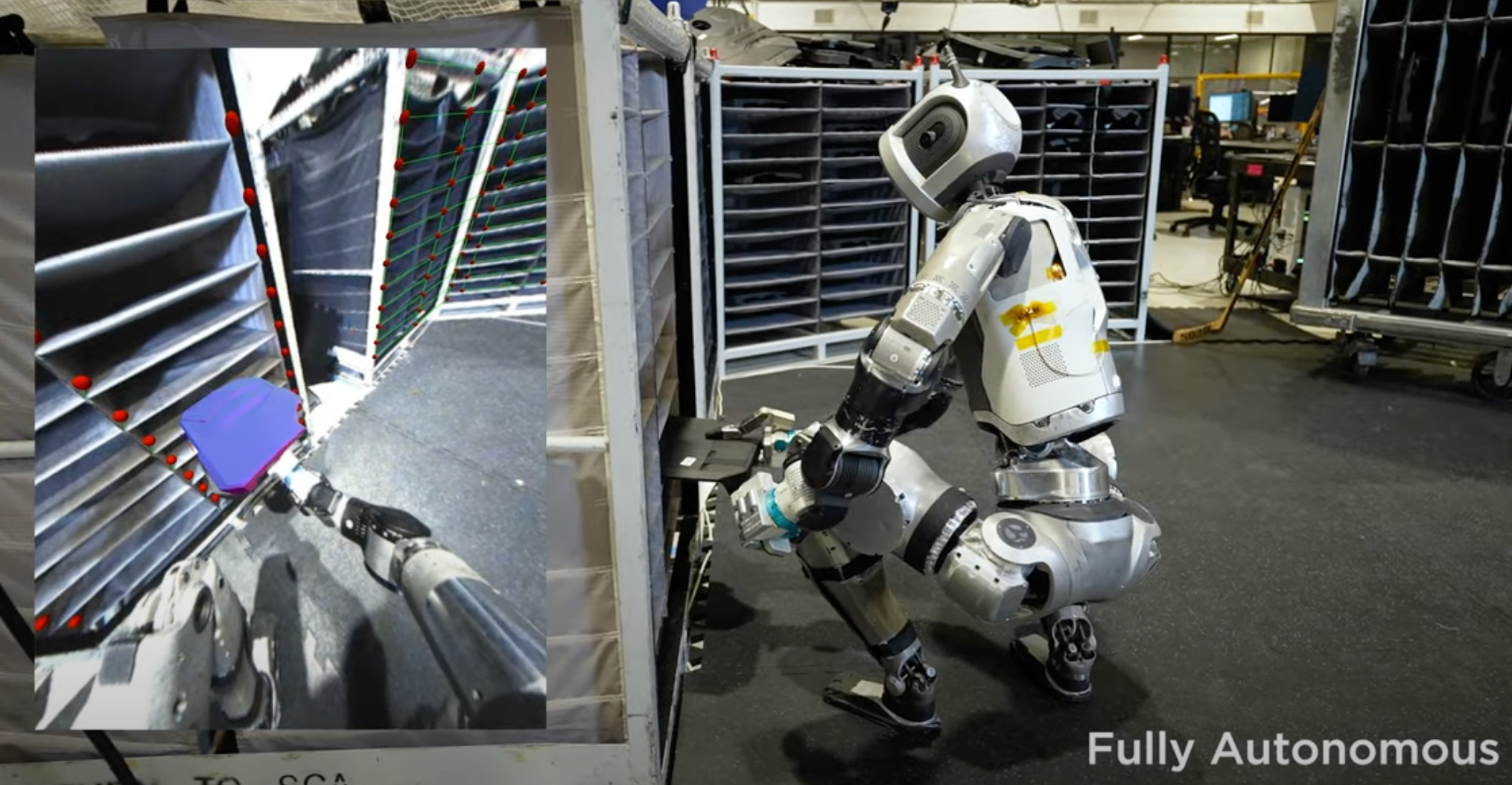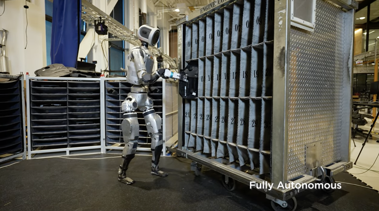 Atlas uses a machine learning (ML) vision model to detect and localize the environment fixtures and individual bins [0:36]. The robot uses a specialized grasping policy and continuously estimates the state of manipulated objects to achieve the task.