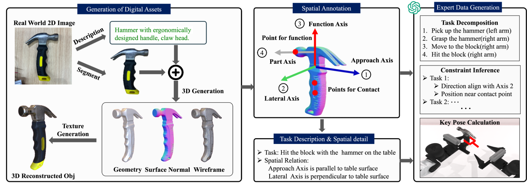 该方案与RoboTwin采用的方案类似,通过自动解析关键功能点、功能轴之间的关系,推理3D空间上的几何约束,最后通过运动规划模块进行轨迹的优化和求解。