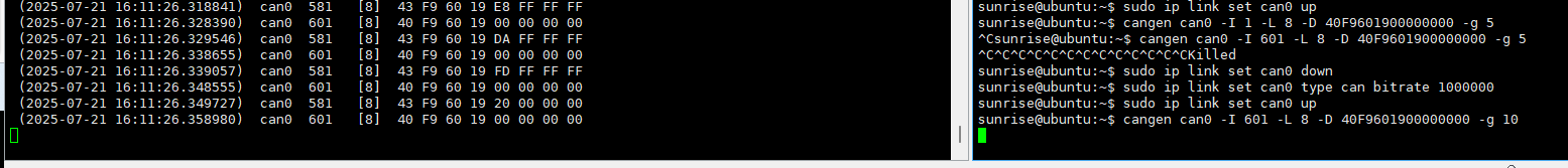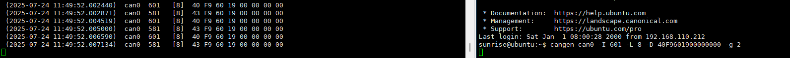 sunrise@ubuntu:~$ cangen can0 -I 601 -L 8 -D 40F9601900000000 -g 10