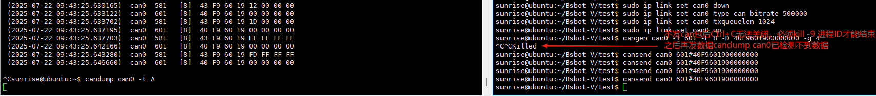 使用测试指令:cangen can0 -I 601 -L 8 -D 40F9601900000000 -g 5