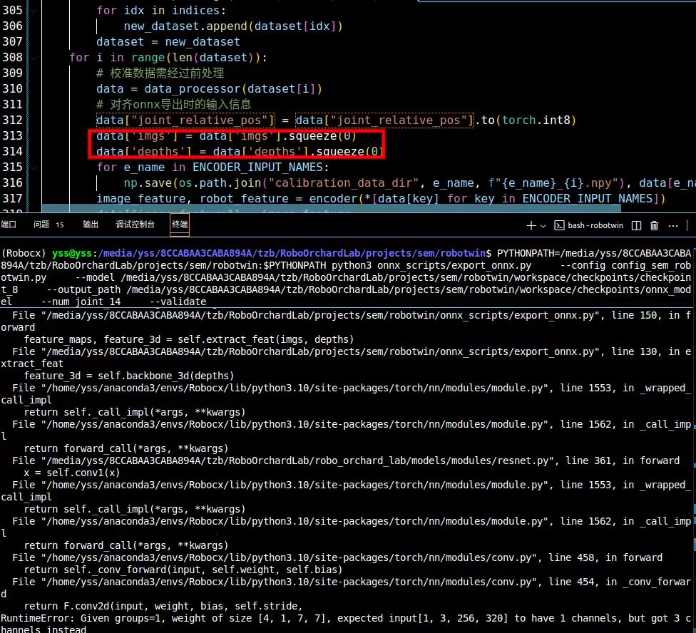 在RoboOrchardLab-master/projects/sem/robotwin/onnx_scripts/export_onnx.py中添加代码如下,目的为导出 onnx 时 dump 模型部署的部分评测数据作为PTQ量化的校准数据,校准数据需经过前处理,样例代码如下: