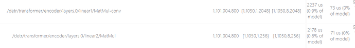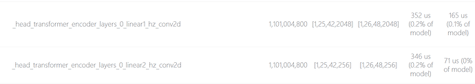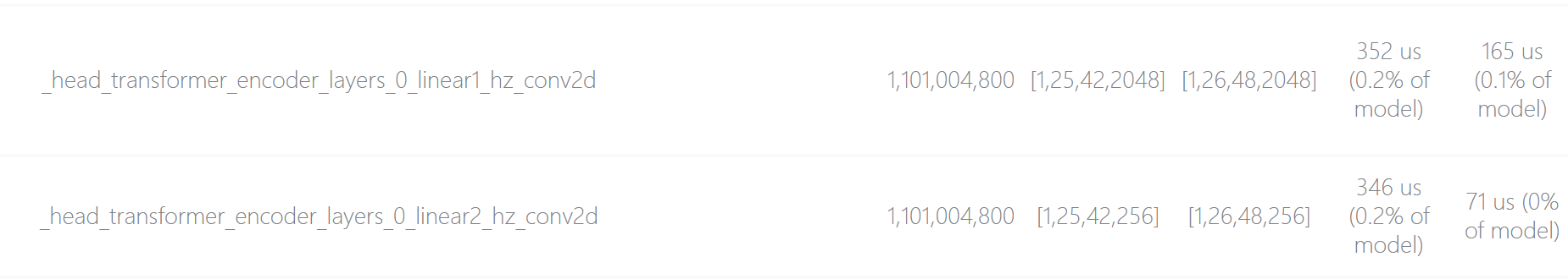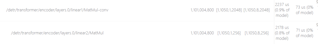这里还是以DETR算法为例,对于encoder中layers0的线性层计算,公版算法和地瓜优化算法的耗时情况如下: