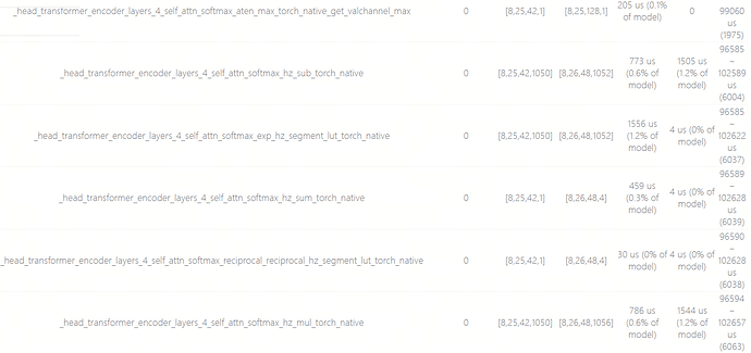 使用fast-perf编译优化后的模型,得到html静态性能分析报告,查看CrossAttention中的算子预估耗时,发现原本200us以上的Reshape操作已经消失,且所有数据搬运类算子均没有额外的BPU硬件对齐。现在的Reshape和Transpose算子均只有很轻微的耗时。