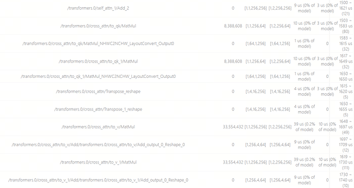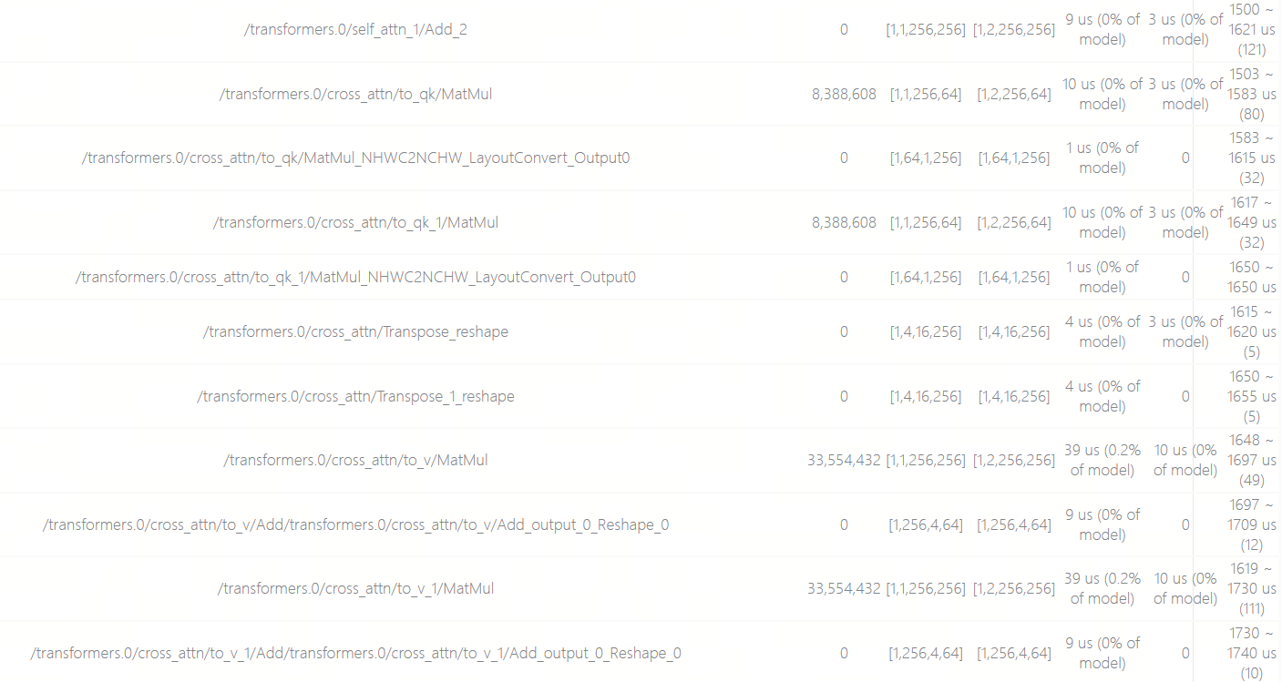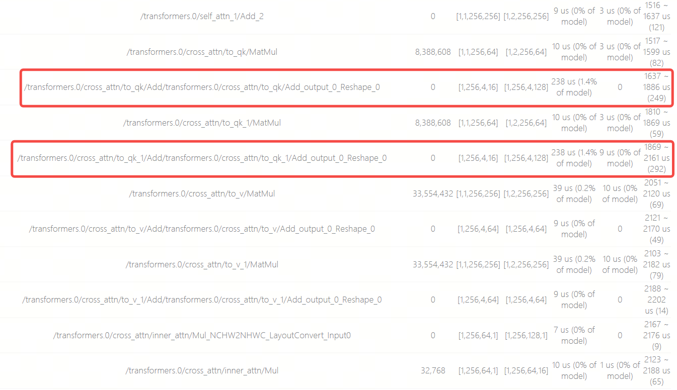 通过对比代码和html信息,可以定位到CrossAttention中耗时最高的两个Reshape算子对应qk0 = qk0.reshape(1, 256, 4, 16).permute(0, 2, 1, 3)和qk1 = qk1.reshape(1, 256, 4, 16).permute(0, 2, 1, 3)这两句代码中的Reshape操作。