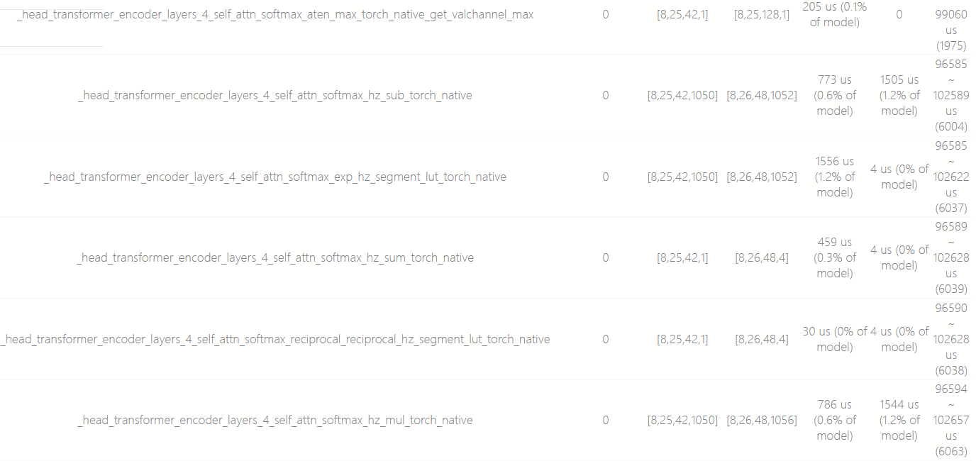 这些差异主要体现在SelfAttention部分,公版算法是对1x8x1050x1的Shape做Softmax,而地瓜优化算法是对8x25x42x1的Shape做Softmax。这个调整没有改变计算量,但是重排了Softmax的计算维度与批次结构,从而提高了并行度与缓存命中率。多个小Softmax(42维)比单个大Softmax(1050维)更容易并行化,并能让访存更加连续,减少访存延迟。多个Softmax同时分配到不同计算单元,使BPU计算资源被更高效地利用,从而有效降低计算耗时。