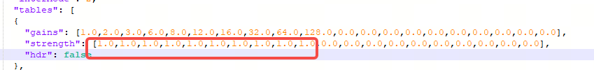 3,如果觉得四周都比中心要亮,那可以调整ISP参数来缓解,前提是设置"interMode": 2,其次修改如下截图的Strength参数,1代表100%补偿,可以尝试降低,比如0.5,Strength LUT跟上面gain lut是一一对应的;